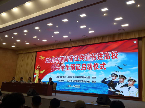 4月25日上午,湖南省征兵宣传进高校暨大学生预征启动仪式在中南大学新校区讲堂举行。省军区副政委、 省征兵领导小组副组长喻军少将,省教育厅副巡视员左清,省军区动员局副局长、省征兵办公室副主任欧阳大力,中南大学副校长蒋建湘等领导出席会议,各高校主管武装工作的副校长、武装部长与辅导员 、学生共2000余人参加会议。