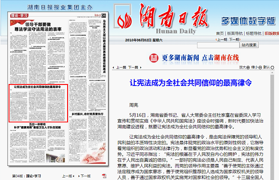 2018年6月2日,校纪委书记周亮结合其学习宪法的心得体会,在《湖南日报》“理论·学习”版发表了《让宪法成为全社会共同信仰的最高律令》的理论文章。