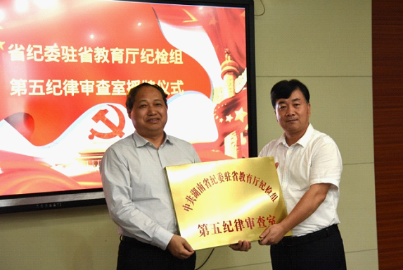 6月1日,湖南省纪委驻省教育厅纪检组第五纪律审查室授牌仪式在我校举行,驻省教育厅纪检组组长、省教育厅党组成员、省委教育工委委员曹世凯出席会议并讲话。驻省教育厅纪检组副组长谭知和主持会议,驻省教育厅纪检组正处级纪检员张心智宣读《关于成立省纪委驻省教育厅纪检组第五纪律审查室的通知》,我校党委书记李三福致辞。驻省教育厅纪检组正科级纪检员彭灿辉、驻省教育厅纪检组第五纪律审查室全体成员和学校校领导、党委委员、纪委委员、专兼职纪检干部、各党总支书记、各党总支纪检委员、部门单位主要负责人参加了授牌仪式。